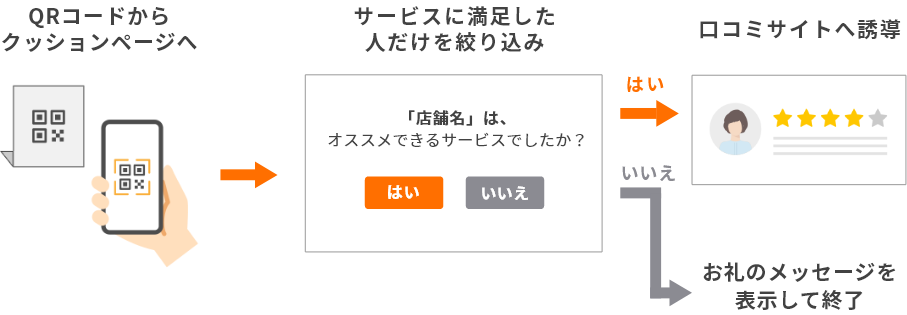 あなたのお店をお勧めしたいというお客様のみ口コミ投稿へ誘導することで、高評価口コミを増加することができます。